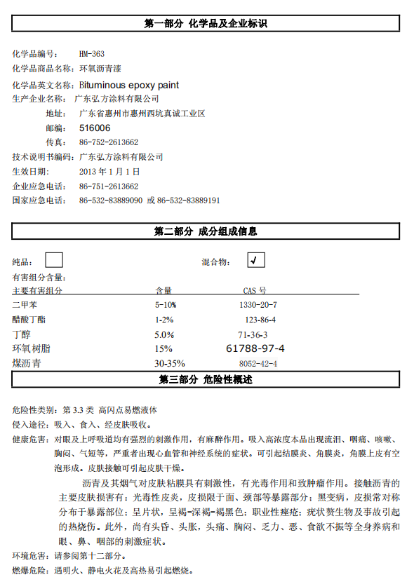 产品总述 HM-363 是双组分煤焦油沥青改性环氧漆,漆膜耐磨,耐海水,耐矿物油性能良好,但不耐多数溶剂。