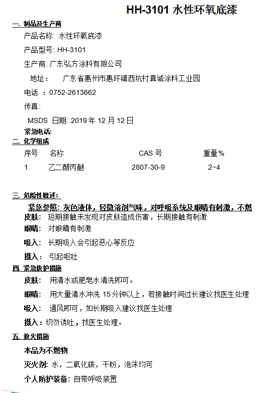 产品总述 HH-3101 是由水性环氧树脂、防锈顔填料、含闪锈抵制剂、水性助剂、水等成分组成的双组份聚胺固