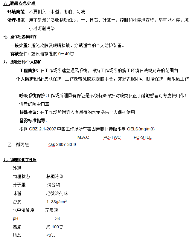 警告:会引起眼睛和皮肤的刺激。反应的蒸汽可能会引起过敏人群的呼吸道刺激。可能会引起皮肤过敏反应。避免呼吸蒸汽。请勿触及眼睛、皮肤。要使用眼、耳、皮肤的防护用具,使用合适的面具,以避免潜在的呼吸道刺激。使用后用清水彻底的清洗皮肤。如有不适请咨询医生。衣物再次使用前要洗涤。如果没有呼吸要进行人工呼吸,最好嘴对嘴,并请医生处理。灼伤:放热反应会使产品变热,超出正常水平。在混合后要小心处理。使用手套。急救:如果不慎接触了眼睛,立即用清水冲洗至少 15 分钟,并脱去污染的衣鞋,用肥皂清洗接触后的皮肤。
