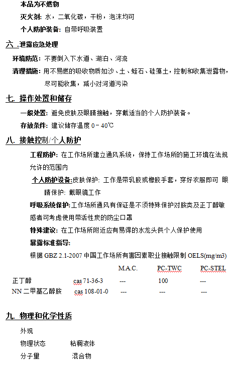 会引起眼睛和皮肤的刺激。反应的蒸汽可能会引起过敏人群的呼吸道刺激。可能会引起皮肤过敏反应。避免呼吸蒸汽。请勿触及眼睛、皮肤。要使用眼、耳、皮肤的防护用具,使用合适的面具,以避免潜在的呼吸道刺激。使用后用清水彻底的清洗皮肤。如有不适请咨询医生。衣物再次使用前要洗涤。如果没有呼吸要进行人工呼吸,最好嘴对嘴,并请医生处理。灼伤:放热反应会使产品变热,超出正常水平。在混合后要小心处理。使用手套。急救:如果不慎接触了眼睛,立即用清水冲洗至少 15 分钟,并脱去污染的衣鞋,用肥皂清洗接触后的皮肤。